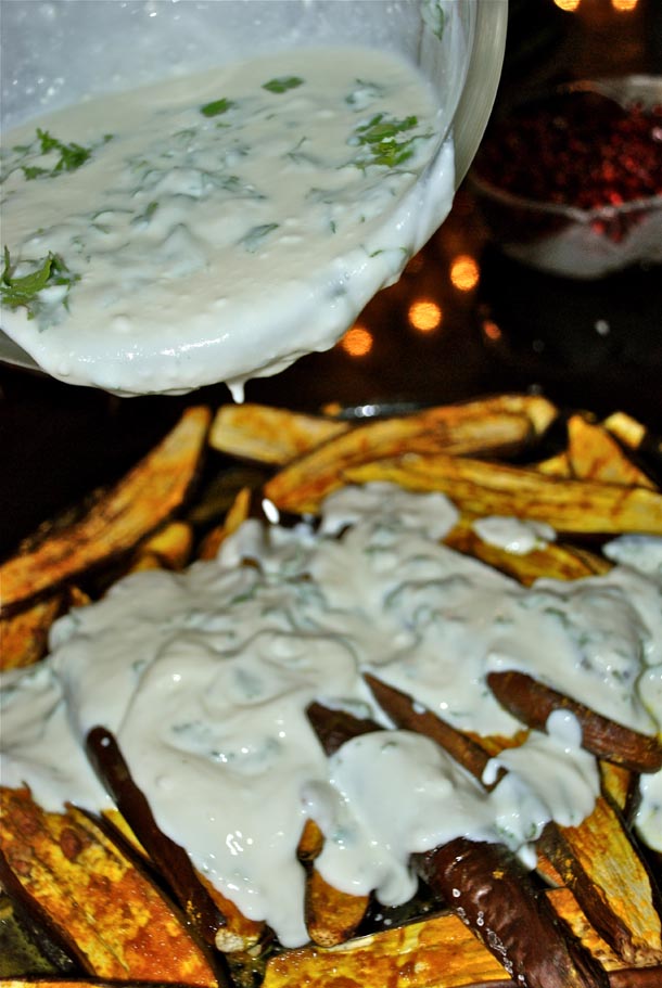 – Smear the Aubergines with turmeric, salt and garlic powder and let them aside for 10 minutes