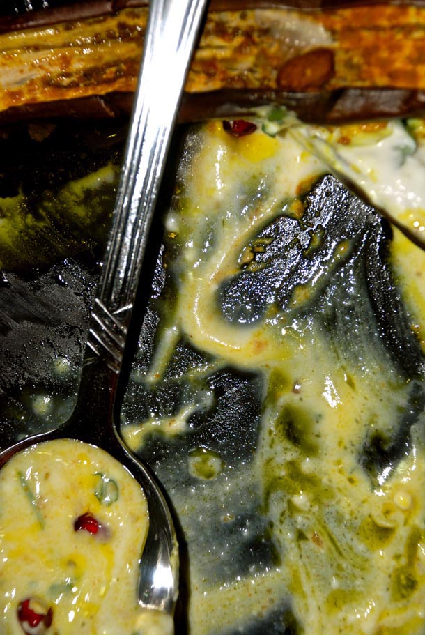 The Bong Connection – Yoghurt Aubergine or Doi Begun could well be another variation of the many aubergine preparations that the Bengali Cuisine has to offer. The adding of the Mustard Oil while garnishing is also very very Bengali. Bengalis often mash steamed vegetables with a dash of Mustard Oil (called Bhaté, specially Mashed Potatos or Aloo Bhaté). And adding Mustard paste or Shorshé will probably make it even closer to the Bengali heart and palate. But the strong Mustard paste and the Mustard Oil may take the dish away from others’ heart and palate. So, I think I will take the middle path and keep the dish a bit more Mustard-light!