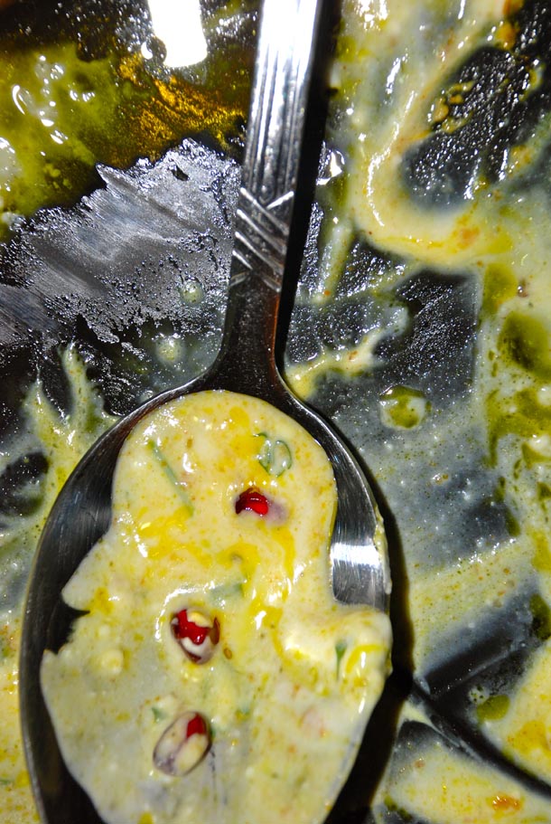– Pour the uncooked Mustard Oil over the Yoghurt mix to leave strong aroma