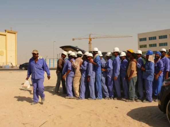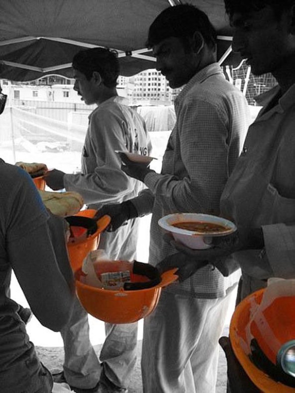 My first Thursday of being a Mum who shared was an eye-opener. My contribution was very little – 25 juices of 250ml/each, probably from my stock meant for the Z-SISTERS’ school snack. I accompanied the Mums to a dusty construction site in one of the many on-going construction sites around Jumeirah Beach Residence (JBR). The food was collected mostly at the Ground floor parking of Bahar 4. Cars with individual Mums dropped in various food items. There were collected and stacked into two or three 4-wheel drives along with pots and pans filled with hot home-cooked salans/gravies of Chick peas, Potatoes or an occasional chicken preparation and all the other items like plastic disposable containers, plastic spoons etc that has been collected over the previous week. When we entered the construction site the workers would be instructed to stand in a line. A make-shift tent would be put up in seconds. Thish Thash! Car-keys would be used to slash open the plastics or the cardboard cartons containing biscuit. Slash, slash! Mums would start handing over the food. Jaldi Jaldi – Juice lelo Bhaisaab!/Fast Fast, Go Mister take the juice next… The first Mum hands over the Plastic Plates, bowls and spoons. Onto the next Mum – Pita Bread. Onto the next Mum – Khaboos/Arabic Flat Bread. Onto the next Mum – Chickpeas. Onto the next Mum – An apple or an orange or a banana. Onto the next Mum – A fruit yoghurt. Onto the next Mum – Chilled Juice/Coke can. Onto the next Mum – A biscuit pack. Khalaas/Done? Jaldi Jaldi/Quick Quick! Dusra/Next? All executed in an organised manner, planned to precision. Come hail (or should I say heat here?) or storm (or should I say Shamal/Dust storm?) every Thursday would be the same.