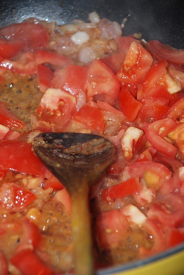 – Add Onions, Ginger, Garlic, chopped Tomatoes and fry till the onions turn brown and the tomatoes turn tender