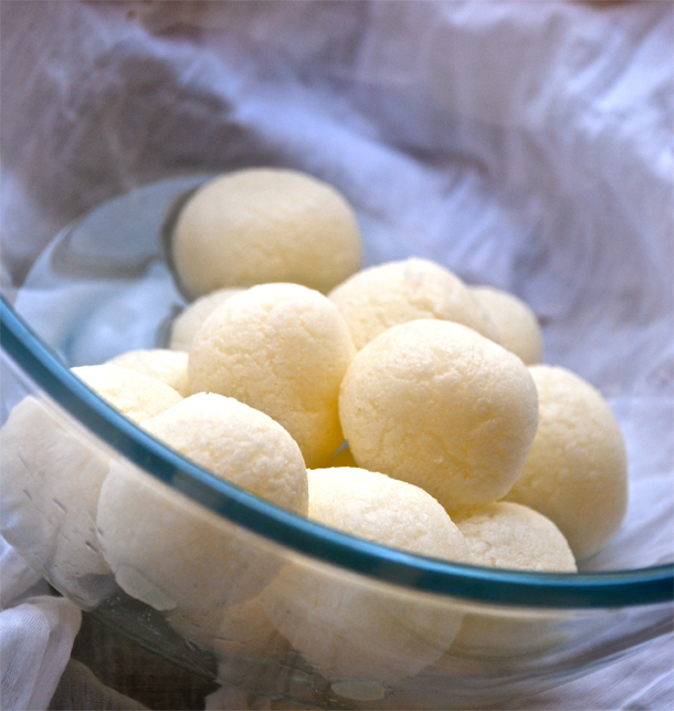 The following Rasgulla recipe is from Cook Like A Bong. I have used the same recipe with stupendous success. The Rasgullas came out soft and round and absolutely crack-less!