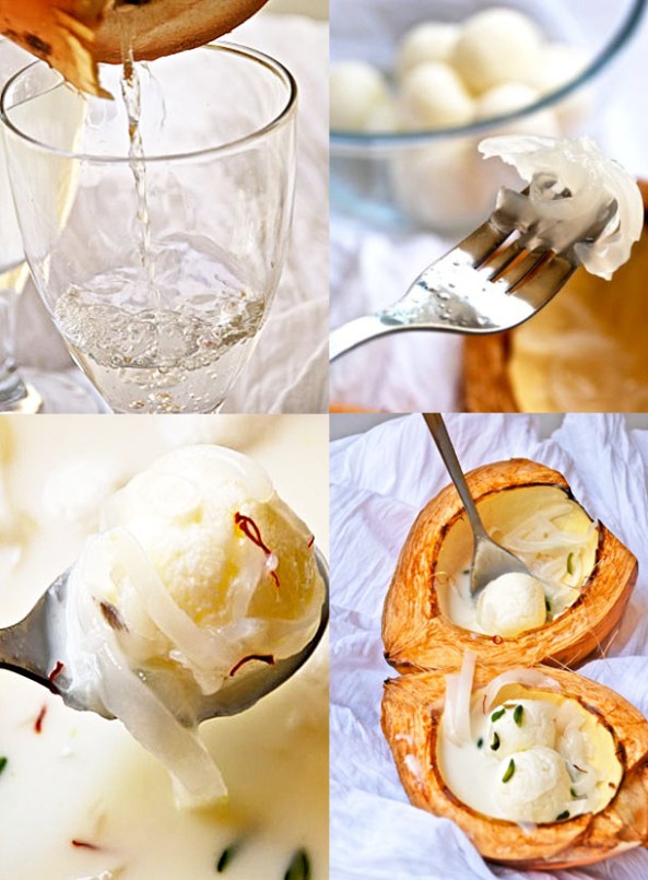 Hailing from Philippines, this is a variety of coconut which has more flesh than the regular coconut. They are extensively used in making Filipino sweets, fruit salads, ice-creams with Macapuno flavours etc. Bottled or canned Macapunos are easily available in regular supermarkets in Dubai (Choitram’s, Al Maya Lal’s, Spinneys etc) and are available in different colours – green, red etc. I prefer to buy only the white Macapuno to complement the sanctity of my white Rasgullas!