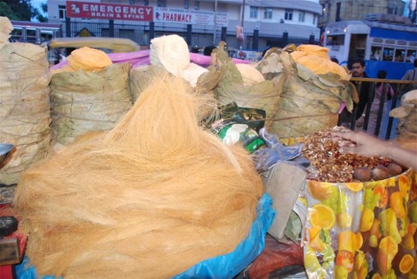 During the last Eid ul-Fitr we were enjoying our summer holidays in Kolkata – a period I like to call my summer hibernation! I took the Z-SISTERS to Mallick Bazar in Park Circus area (above). This is essentially a Muslim neighborhood and the road-side kiosks were full of Samaiya/Semolina, mixed dried fruits, Firni (a dessert pudding made with Rice Powder) mix, glass bangles – absolutely mersmerising the otherwise unperturbed Z-SISTERS. The Semaiya bundles were stocked up high looking quite surreal – as if they were fluffs of cotton wool blown by the festive breeze (below).
