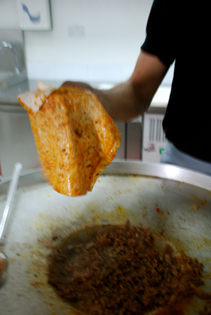 The story of Tantuni: Tantuni sellers are found on every street corner in many Turkish cities – including Istanbul. The speciality of the Tantuni rolls are well kept secrets of the Tantuni Chefs. The Tantuni Chefs, as they are proudly called, have their own secret techniques of making Tantunis (some boil the meat a bit more or fry their meat a little bit less or have their own proportions of spices). So the taste of Tantuni differs from one Tantuni shop to the other. The pans where Tantunis are cooked are also special. The central part of the huge pan indents downwards. The oil is put here and the diced meat is added in little amounts as they are brought forward from the bigger pile that surrounds the rim of the Tantuni pan. And as the spices are added, the sound that the entire act makes – Tan/Tun, Tan/Tun… this probably lends the name to the dish. And finally, a lot of spices are added. All I can say is, this has to be the crucial act in making the Tantunis so addictive!