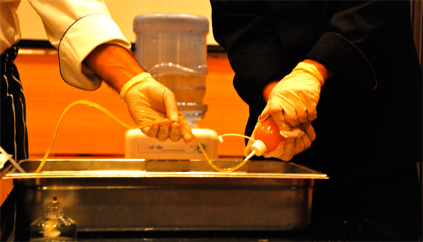 I felt as if I was in a futuristic sci-fi kitchen in a laboratory, where ingredients with names like Maltosec and Isomalt – all popping out of cans as jellies and powders and going into various cooking ‘equipment’ requiring ‘techniques’ and ‘temperature control’ and ‘time measurement’! The above image shows making of spiced mandarin jelly spaghetti, in the SOSA session that I attended, held in The Emirates Academy Of Hospitality Management. Though, I was fascinated with the entire concept, I concluded that I am a taker for spluttering of oil, chopping the actual fruits and vegetables, feeling them under the running tap water, taking in their aroma as I load them into my basket in the supermarket, panting Oophs and Aahs as the gravy starts sticking into the pan and all the melodramatic nonsense associated with the verb Cooking. For me, this was Food under surgery, if the aroma had to be blown into the dessert through a tube. For me, the food that was cooked, didn’t have soul. I didn’t care much for what some described as a Culinary Art.