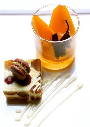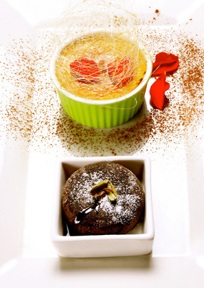 Gulab Jamun Cheesecake – Saffron poached Pears, Macroons (above left); Gulkand crème brulee; Cardamom flavoured Chocolate Fondant (above right)