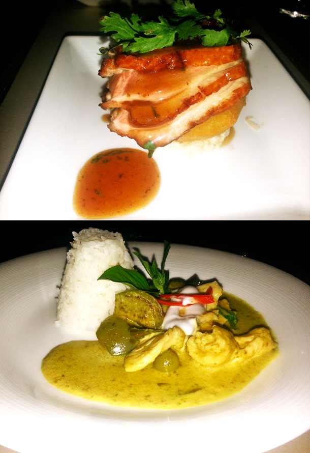 We tasted some of Thiptara’s speciality dishes that the restaurant will offer at the Taste of Dubai. For Salad, there was Yum Som – O or the Pomelo salad mixed with minced Chicken and Prawns. The salad had a crispy coconut dressing making it’s taste slightly sweet while retaining the sourness of the Pomello, nevertheless refreshing all the way. For the Starters, there was Thod Maan Goong or Thai Prawn Cakes, deep fried and served with Cucumber, Peanuts and a sweet Chilli Sauce. The Chef said that he had added his own style in making the Thai Prawn Cakes, infusing into the taste a lot more Thai herbs than it’s normally done, specially Lemongrass. This extra infusion lent more flavour to the dish without making it actually spicy.
