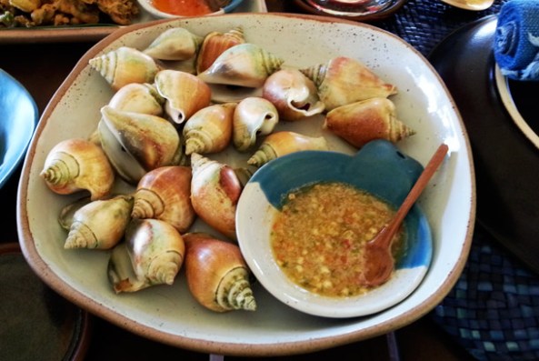 Hoi Chak Teen: The first dish that we were served was the Hoi Chak Teen or the Dog Conch (above), considered to be the king of Krabi shellfish. These shells can be seen sold on beaches, grilled or boiled and served with a really spicy chili sauce dip. Chak teen means ‘feet pulling’ and hoi means ‘shell’. These conch shells pull its’ feet around. So for making a pot, you heat gently, starting with cold water. This way, the feet pulling shells pull their feet, so when cooked, they can be easily picked out of the armour. While Debbie pulled (above left) out the meat with a tooth pick from one of the conch shells, I have to admit that I was a bit faint-hearted, preferring to click her. It’s hardly surprising, as Debbie is the kind who climbs the Mt Kilimanjaro while I would prefer to fly over the Himalayas rather than climb it. (Info courtesy on Hoi Chak Teen from the internet)