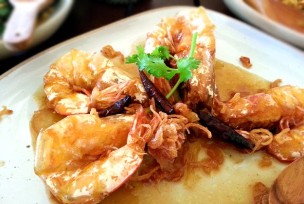 Goong Makham: Prawns in Tamarind Sauce (above) – this is a dish that I’ve come across many times in this trip and ended up falling in love with. So far my experience with Tamarind Sauce has been with Malabar fish curries or the Goan fish curries but not in any Thai preparation. As I started my queries, this dish turned out to be a very easy preparation. Palm sugar is added into a wok over a low heat and stirred continuously until the palm sugar starts to melt and turn a little brown. Tamarind juice, fish sauce and pepper is added and stirred in for a few minutes until the sauce starts to thicken. Finally, the prawns are added and simmered for about 2 minutes and served with a garnish of fried onions and garlic… oh did I just give out the recipe? Well, I did, I guess… such a simple recipe could be easily recreated at our homes.