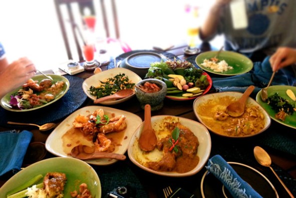Our first stop after driving out of the Krabi airport is the Ruen Mai restaurant. Situated in the middle of lush green Banana and Sugarcane plantations and what seemed like being dropped just on the highway, this our first experience of an incredulous Thai hospitality and Thai food. Our experience set a very high benchmark for the rest of our trip. This is a new restaurant that the owner has opened just next to his residence. The original Ruen Mai restaurant in Krabi town, is regarded as one of the best Thai restaurants in Krabi. The swinging foot bridge from the main road with a bamboo fence brings us onto the platform – the seating area with an impressive thatched conical roof built with bamboos. Under the shade of the thatched bamboo and wiping our sweats and panting oofs and aahs, we met all the other members who’d come from London and Frankfurt. It was obvious that the soaring high humidity and the overnight journeying left all of us drained. Only to be refreshed by the lunch at Ruen Mai. That too, with an absolutely stunning lunch (assuming, that stunning can be used as a metaphor for the oft-used word awesome!)