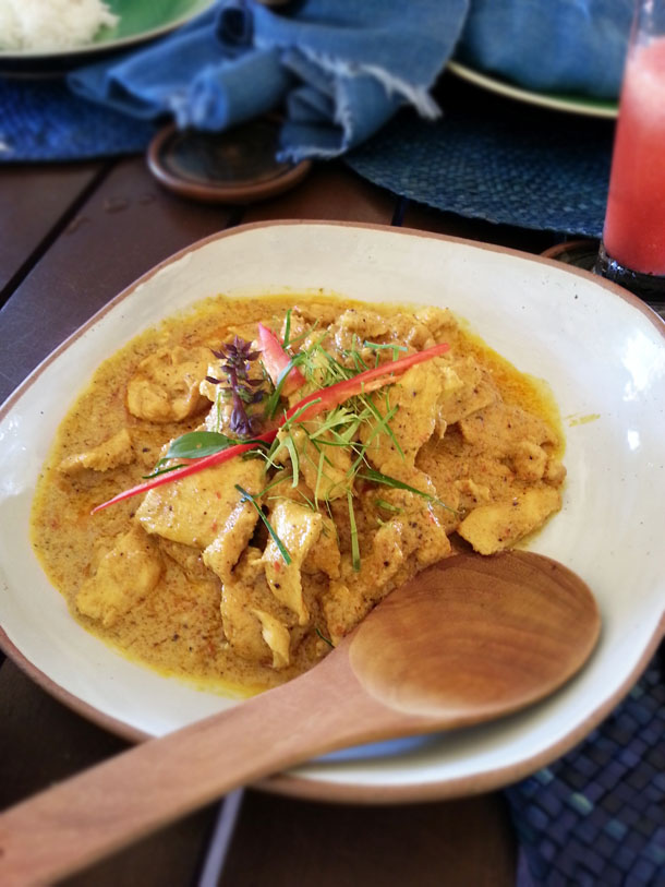 The Red Thai Curry in Southern Thai Cuisine is not red in colour! This was one revelation that practically shocked me initially. A few twitter conversations followed with my Bong food blogger friend Kaniska, who writes down his random thoughts and encounters with food in his blog For the love of food. Apparently, in the Thai curry lessons that he took in Chiang Mai, he had to produce a very very red curry and he felt that the proportions of the red chilies that were put into the red curry paste had something to do with the colour. I argued that both Debbie and I had indeed put in a lot of red chillies in the cooking class that we took later in our trip and yet our red curry didn’t turn out red. Our Tweetversations (conversations on Twitter) led us to the conclusion that in the southern way of Thai cooking we were also grinding whole Turmeric or Kamin along with red chillies, thereby diluting the red colour of the Thai red curry. A bit of study into the Southern Thai curry reveals that there is a prevalence of coconut milk and fresh turmeric in most dishes here, as compared to other regions.