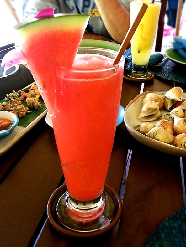 Smiling faces and chilled Coconut water helped in lowering our body temperatures much faster than we imagined. Definitely faster than it would have with regular air conditioners. The chilled Coconut water disappeared in seconds and I ordered a fresh Watermelon Juice (above). No added sugar, plain simple freshly squeezed Watermelon, with loads of ice cubes dunked in. There is a lot of controversy with the ice cubes in Thailand – to have them or not to have them? Many suggest that one should only take ice if it is one of the round, cylinder type cubes that has a hole in them as these type of ice cubes are supposedly commercially produced in hygienic conditions. Whatever it is, I think it is the heat and the humidity that makes one forget the logistics and ask for ice, whether it’s in a restaurant or while ordering a drink off a street vendor. Ao nam keng?/Do you want ice? I don’t remember saying Mai ao nam keng/No, I don’t in my entire stay in Thailand. It only takes a while before you get addicted to the ice itself!