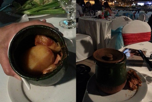 The Buffet had many traditional Iranian dishes. We tasted the Sabzi Polo Mahi – the special traditional dish that is cooked to celebrate Nowruz. Sabzi Polo Mahi is Rice with green herbs and is served with fish. But the dish that absolutely mesmerized me was Dizi. Dizi or Abgoosht is a popular Iranian dish – often termed as a classic meal. Dizi refers to the small clay pot (above) in which the food is cooked and served. Lamb, potato, chickpeas, tomato and turmeric – everything is steamed in an oven on low heat for many hours. Dizi recipes seem to have been handed down from generation to generation over thousands of years and vary from family to family, town to town and district to district. The gravy or the juice is taken from the Lamb is taken out from the clay pot and then the potatoes and lamb is blended into the remaining gravy by stirring and mashing in with the rest of the ingredients. Freshly baked bread is broken into pieces and dipped into the gravy (which was initially taken out of the Dizi; image below) in a bowl. Into this gravy now goes the mashed paste of Lamb and Potatoes etc. My observation – If the Aloo or Potatoes from the Bengali Kasha Mangsho were mashed into it’s own gravy and then served with Iranian bread, it would probably turn into a Dizi. {While I do not have the recipe of Bengali Kasha Mangsho in my blog, I do have a ‘spirited’ variant – Mutton Kassa With Red Wine And Red Grapes}. There are many more traditional Iranian dishes like Dolmeh or stuffed vegetables, Koofte/Meat balls in the Ezi Dizi menu. Gelare insisted that we try the Iranian Faloodeh. I’ve never been been fond of Falooda that accompanies Kulfis, the sub continental version of Ice creams if I may describe them like that. The Iranian Faloodeh is definitely very different – this is a cold dessert and tasted more like a Sorbet. Traditionally, the Faloodeh consists of thin vermicelli noodles made from corn starch mixed in a semi-frozen syrup made from sugar and rose water. And yes, I loved my Iranian Faloodeh. {A cute recipe of Kulfis that we made at home… Colourful Kulfis | Celebrating The Colours Of Holi!}