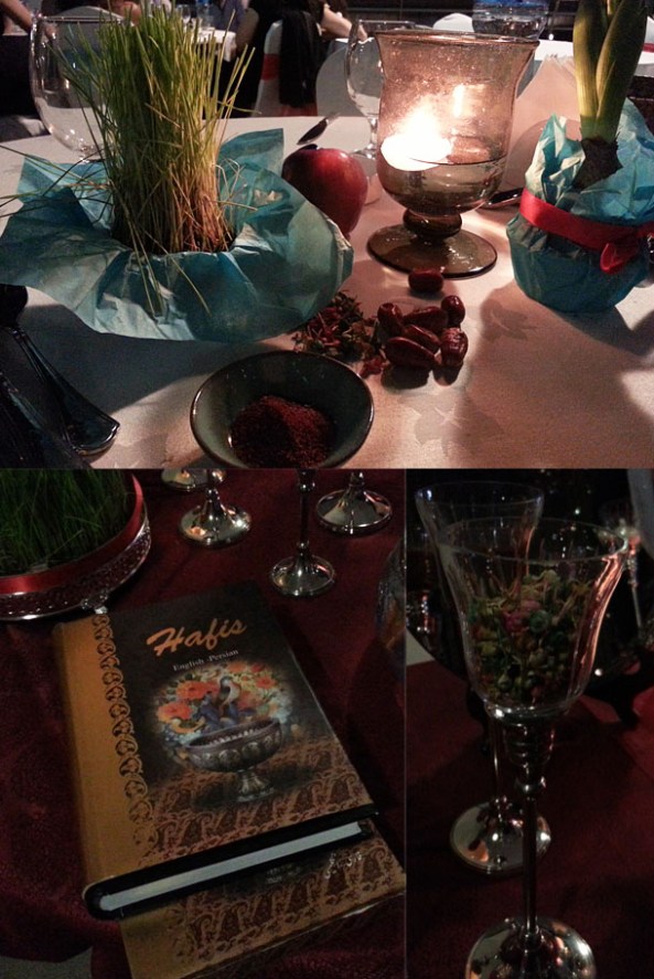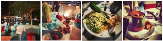 I heard that Ezi Dzi (pronounced ee-zee dee-zee), a new Persian restaurant in JLT, was celebrating Nowruz, the Iranian New Year with a traditional Iranian Buffet in an outdoor setting from fellow blogger Debbie who blogs at The Real Geordie Armani. It was a busy Wednesday and I called the restaurant thrice to inform that we were going to be delayed. At 10:30pm, when I was about to cancel my reservation(S said that he was so caught up that he wouldn’t make it before 11:30pm), Gelare, who c0-owns the restaurant, managed to convince me that people would still be coming in late and yes, food will still be there (in plenty, that is!) even if we reached around midnight. I’m glad that we did manage to visit Ezi Dizi – the entire place looked so festive and thronged with Iranians who had come to dine with their families and friends in order to usher in their Nowruz. The table settings were done up in the way it is done traditionally to celebrate Nowruz (above) – with the Haft Sîn or the seven ‘S’s – that is with the seven items starting with the letter ‘S’ or Sīn in the Persian alphabet. Books of Hafis, the 14th-century Persian mystic and poet lay on the table – creating a very elegant ambiance. {More on Nowruz…}