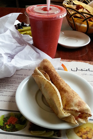 What goes into making the Atutomatic’s best Chicken Shawarmas? Along with shreds of smoky, slightly burnt, tender Shawarma meat goes into the Khaboos bread and are kept succulent with chilled and the most delectable Garlic Sauce, Mayonnaise (if you insist), pickled Cucumbers and French Fries. A modern addition would be the French Fries inside the wrap which soaks up the sauce and juices. For once soggy French Fries seem absolutely acceptable and delicious. The Khaboos pocket then holds all of these together and is wrapped in butter paper. A small Shawarma wrap cost Dhs 8/- (approximately 8 inches long) and a larger variant comes at Dhs 16/-. Both are served with sour pickles. Wash it down with a fresh chilled Strawberry juice. Though Tahini (a paste made from ground, hulled sesame seeds and used extensively in North African, Greek, Turkish and Middle Eastern cuisine) is not used in the Chicken Shawarmas, keeping it exclusive for the Lamb ones, I ask a bit of Tahina to be put into my Chicken Shawarma – as much calorie loaded it can be!