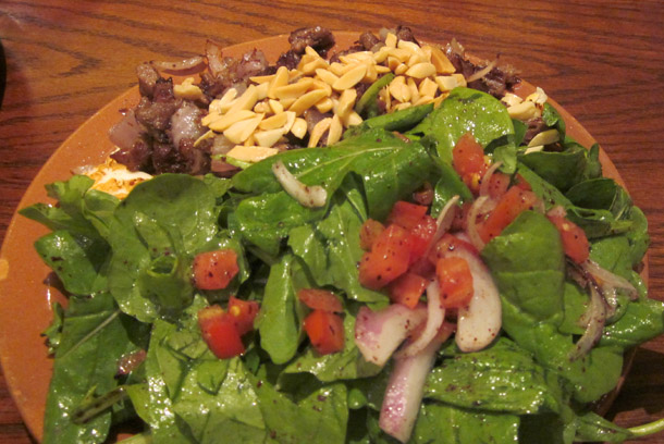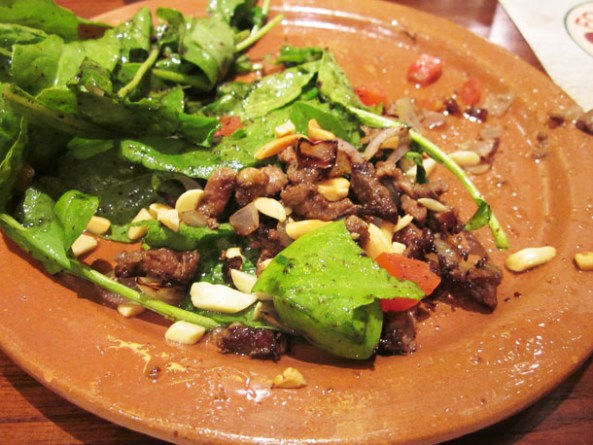 Halloumi or Halloume or Halumi is a semi-hard Cheese which is very popular in Cyprus, Greece and the Middle East. (Originating in Cyprus, Halloume is an unripened brined cheese made from a mixture of goats’ and sheep milk, and sometimes also cows’ milk It has a high melting point and so can easily be fried or grilled. No acid or acid-producing bacterium is used in its preparation). Mom’s Food as the name suggests is exactly that – the restaurant serves Mediterranean food (a bit of Greek, Italian, Middle Eastern, Moroccan, Turkish – confusing it may sound but the menu is not that elaborate – it just has a few dishes from the different types of cuisine) cooked in the way a Mom would cook at home for the family. The food lives up to the name. And the Halloume here crowns above the rest – the secret of the grilled Halloume has to be revealed by uncovering the toppings – the succulent pieces of fried marinated Lamb cubes, and served with sliced Almonds and fresh Rocca Salad tossed in Olive Oil and Lime. At Dhs 40/- for a plate of Mom’s Halloume, this is delicious food – refreshing and sumptuous with lots of greens.