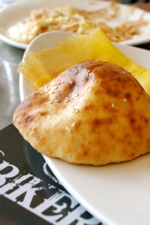Flavor of Arabia, which is a traditional Emirati breakfast platter. Though there are lot of options in the Menu in this very trendy, first motorcycle-themed cafe in the UAE, my recommendation is this breakfast platter as there are not many places in Dubai serving Emirati food. And let’s face it, the cafe does churn this up deliciously. On a plate (below) there is a puffed up fluffy Khameer (left picture further below) sprinkled with Sesame seeds, two Chebabs or Emirati pancakes, all sitting on a thin, folded Muhalla which is like the South-Indian Dosaserved with Jam, Honey, Dates and Kraft Cream cheese spread. The not so drippy, thick and slightly sour tasting creamy Kraft cheese complements all the above perfectly, specially the thin crispy Muhalla when dipped into the creamy Cheese. One note of caution though – the Chebabs are slightly sour to taste.