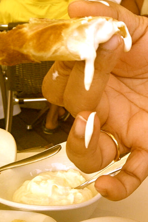Manakish is a popular Syrian and Lebanese food – the Middle Eastern version of a Pizza, either eaten as slices or folded. Also known as Manaqish, Manaeesh or Manakeesh or in singular form Man’ousheh, here the dough is first rolled out flat, and little dips are created for the topping to lie in, by pressing the dough with fingertips. Though the Za’atar (Za’atar is very popular in Middle eastern cuisine, used as a sprinkler on many Arabic dishes and is prepared by using ground dried Thyme, Oregano, Marjoram etc) is the most popular topping, the other classic toppings are Cheese, minced Lamb, Kishq, Spinach etc… my absolute favourite being the ravishing Chilli Minced Meat Manakish. My recommendation is to go for extra Chilli – you can always wash down the heat with some chilled Laban drink. A big Manakish would cost from Dhs 12/ – Dhs 16/, depending upon the topping.