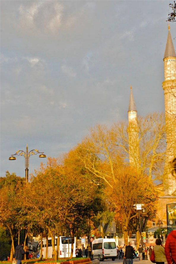 Sultanahmet Camii or the Blue Mosque… The strangers who became familiar in the Sultanahmet Square… The kaleidoscopic Kapalıçarşı or the Grand Bazaar… The mystical Ayasofya or Hagia Sofia Mosque… Topkapı Sarayı or the Topkafi Palace (photography isn’t allowed inside the palace museum)… The beautiful fall colors and people in the Sultanahmet Square… Istanbul at night time – view from Istanbul Sapphire, the tallest tower in Europe and then in the backstreets of the magical Ortaköy… Walking along the backstreets through the alleys of old Istanbul as we arrived at the Bosphorus shores…The quirky traces of modern Istanbul peeping along the way…    Around Yeni Camii or the New Mosque by the Bosphorus at sunset… And finally reaching the chaotic Mısır Çarşısı or Spice Bazaar or Egyptian Bazaar… Leaving Istanbul at dusk… Disclaimer: Please note that this post is not a sponsored post and the subject, story, opinions and views stated here are my own and are independent. While you enjoy reading the posts with lot of visuals, please do not use any material from this post. You can see more pictures of my travel and food journey here.
