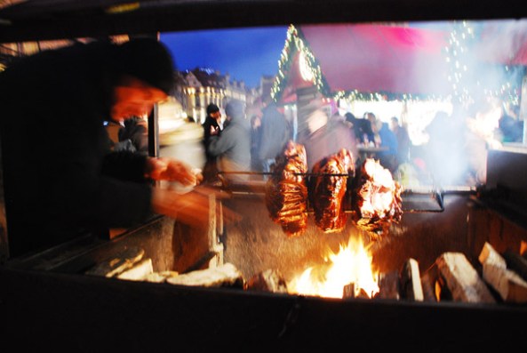 The stalls selling traditional Christmas goodies and Czech cake and sweet pastries like Trdelink (the first image above) flooded the square in front of the Orloj or the Astronomical Clock. This is the heart of historical Prague. To feel it throb, please take a seat in one of the restaurants in the huge courtyard of Old Town Square. As I write down my magical Prague experience, I can almost visualize the souvenir shops selling glittery artifacts and swiveling stars made of Bohemian crystal. I can hear the curly, crispy Potato Chips being deep-fried and almost sniff the oily aftermath left behind in the huge wok. I know that the Lamb will soon be slow roasted over open fire (all the above pictures)!
