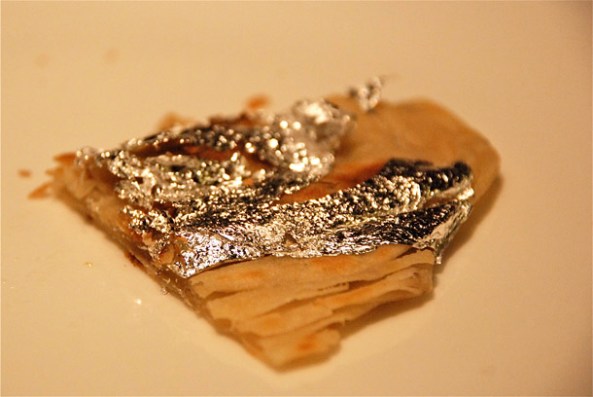 Apart from the Galouti Kababs, I also learnt to make the Warki Paratha, a layered wholemeal flat bread with a coronation of edible silver foil on top (above). These parathas complemented the soft, melting Kababs perfectly. All the hard work (to watch with full concentration amidst the aroma and retaining every bit of the knowledge till I downloaded every little detail and and my five-pence of wisdom onto my humble post, is hard work, isn’t it?) was soon compensated by the Royal North Indian thali (further below) that arrived at the table with an Indian Bellini to gulp down the food with. Indian Bellini, did I hear you say? Well, my food blogger friend who writes Coffee, Cakes and Running, shares the amazingly easy recipe that you may want to try!
