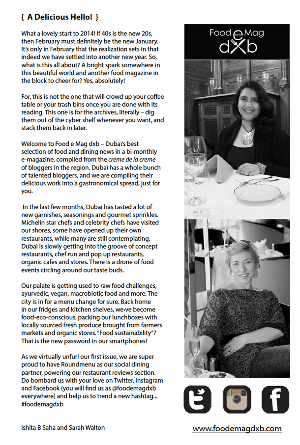 The initial response has been very warm and overwhelming. ‘Inspiring, Beautiful and Different’… are a few of the feedback that we have been getting on our launch issue – we are really thrilled. Have a flip through our much awaited launch issue here… and tell us what you feel and do subscribe if you like it (it’s free!). You may click here to visit the Food e Mag dxb website and also win a ‘Mongolian Dinner Night For Two’ at Mazina, the culinary powerhouse of The Address, Dubai Marina. Do bombard our digital baby with your love on Twitter, Instagram and Facebook (you will find us as @foodemagdxb everywhere) and help us to trend a new hashtag… #foodemagdxb. You will find the icons below and I have kept them really big lest you miss them. But remember, while the magazine is one, it’s a bit schizophrenic on social media – because Sarah and I are completely two individuals with two different ideas on how to approach social media. Expect some frenzy. From my side, I promise that never shall I splatter the magazine, Sarah or myself in my blog. But right now, as she tweeted, yes #woohooImAnEditor!