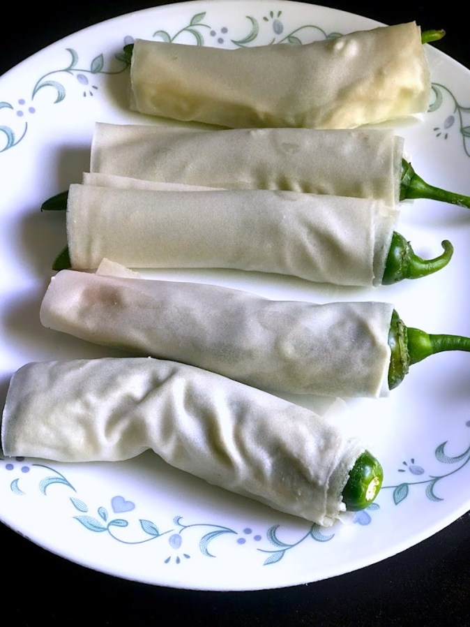 15 long green chillies (you may use jalapeños), min 5″ long For the filling For deep fryingStuffed Chilli Spring Rolls