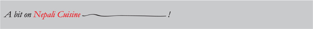 Nepali Cuisine is influenced by the cuisines of both India and Tibet. The use of ingredients is very similar and some of the most commonly used ingredients are as follows – Hing/Asafetida, Mungrelo/Black Cumin Seeds, Cardamom – Alaichi/Black Cardamom, Sukumel/Green Cardamom, Chilli Powder, Red and Green chillies, Hariyo Dhaniya Paat/Cilantor or Coriander leaves, Curry powder, Methi/Fenugreek (most importnat in Nepali Cooking), Saunf/Fennel Seeds, Garam Masala (dry roast of whole spices like Coriander Seed, Cumin Seeds, Black Peppercorn, Black Cardamom Seeds, Ground Cinnamon, Whole Cloves, Ground Nutmeg), Turmeric, Garlic, Ginger, Onions, Scallions, Gundruk (Nepali vegetable dish prepared from green leafy vegetables that are fermented and then sun-dried and is used in soups, pickles and other dishes), Jimbu (aromatic grass from the Himalayan regions and is sold in strands – a pinch is enough to flavour a dish; not available in Asian supermarkets, hence bulb garlic roots are used as a substitute), Jwanu/Lovage Seeds (Ajwain in Hindi), Timbur (another important ingredient used in Pickles), Tamarind pulp.Dishes are cooked in Ghiu/Clarified Indian Butter (Ghee in Hindi) or Mustard oil, Corn oil and Soybean oil.