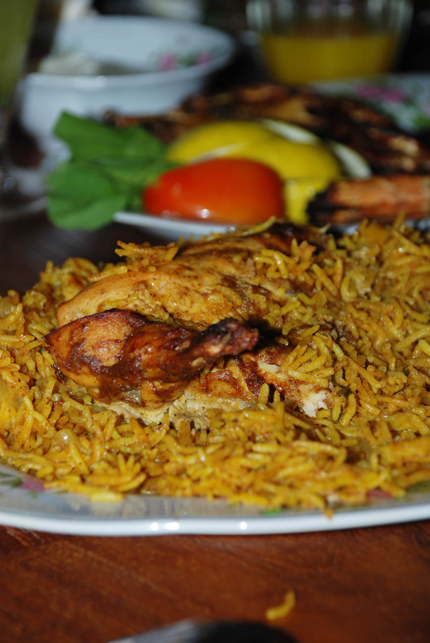 Dajaj or Chicken cooked with Yellow Rice simmered in chicken stock and special Arabic spices and dry lemon