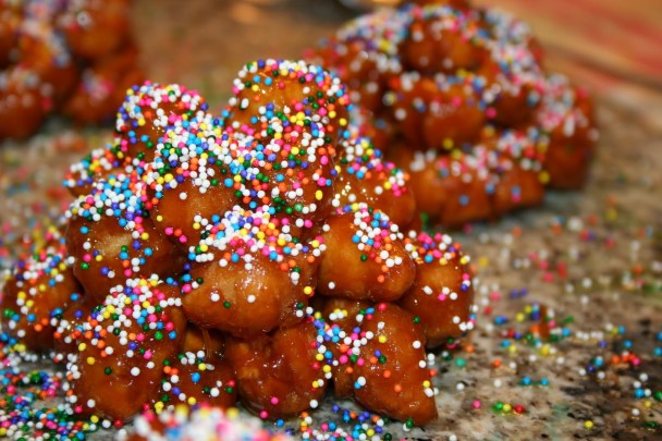 Serve by breaking off individual pieces with cake fork. Pignolata keeps fresh for 2 weeks when placed in a air-tight container.