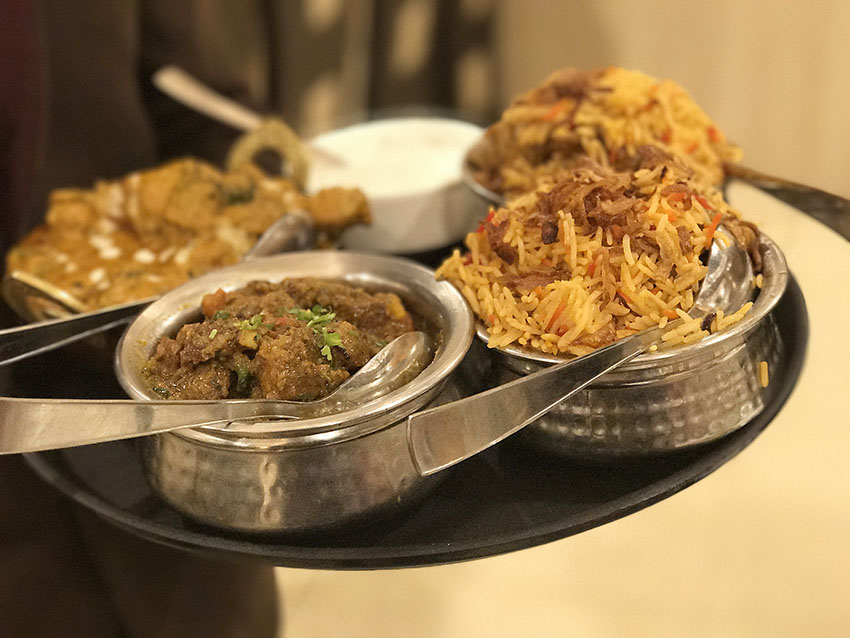 ← Agra style mutton biryani, mutton korma and chicken in Mughlai food in The Mughal Darbar restaurant in Agra