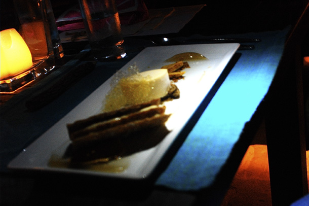 The Desserts: It’s a shame really that the photographs haven’t appeared the way each dish actually tasted (blame it on the romantic ambiance and the candles again!). After having each meal paired with the perfect wine, we still longed for some Desserts not because there was extra space in our tummy, but because we really wanted to see what sweet surprise would spring at us. Our family doesn’t believe in sharing Desserts – hence we all ended up ordering our own respective desserts. The Z-Sisters tasted a Banana split – toasted Banana, smoked Caramel Popcorn, Raspberry Caramel and scoops of Vanilla Ice cream; and Chocolate Slice – interesting slices of Dark and White chocolate slice with Chocolate sauce and White Chocolate crispies. S ordered a Coconut and Mango Mille Feuille (traditionally, a Mille-Feuille is made up of three layers of puff pastry, and two layers of crème pâtissière. The top layer is coated with a sprinkling of powdered sugar. More on Mille Feuille). It was made with Lime powder, Coconut and Malibu jelly, Mango gel, Coconut and Vanilla. I ordered Chocolate. That was the name of the Dessert as well – no fancy French name, only pure Chocolate! This was a lethal Chocolate combo of chocolate liquid, Chocolate Earth (what on Earth is Chocolate Earth? It is Chocolate powder sprinkled all over!), White Chocolate and puffed Rice with malted Milk Ice cream and Raspberries. Phew! Rocket Science is easier than describing the Chocolate!