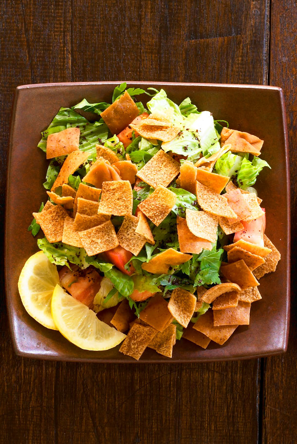 Our family cooking class was set up beautifully at the one of the resort’s Arabic restaurants – the Spice Market. Interestingly, all the furniture in the Spice Market has been created from sustainable wood and boasts of a traditional mud kitchen. A semi circular wooden ring formed our dining table while Chef Hassan demonstrated the Arabic dishes – Fattoush for Salad, Falafel as a Starter, Samkeh Harra/Spicy Fish as a Main Course and our all-time family favourite Arabic Dessert – Um Ali. Um Ali, here was cooked in a slightly different way than the one we had learnt previously at at our cooking class by the beach at Ananatara’s Desert Islands Resorts in Sir Ban Yas Island. The recipe of Samkeh Harra is quite similar to the Prawn Harra that we learnt at Desert Islands, so you could check on that recipe here – Desert Islands Resorts by Anantara | Cooking Spicy Prawn Harra By The Beach. Here, I am sharing the recipe for Fattoush, perhaps, the most popular Lebanese Salad. Sweet, salty and citrusy – it is perfect to combat the hot Middle Eastern Summers. The recipe has been tried and tested at home and I’ve slightly modified it to suit our palate. The Um Ali, however, deserves a separate post altogether. Egyptian in origin, I could wait for my trip to Egypt to write about Um Ali – if only the turmoil in the region would stop. Ingredients Dressing Garnishing Method of PreparationFattoush