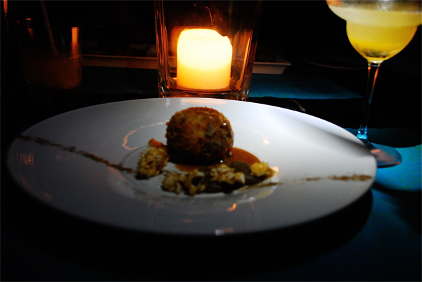 The Starters: Big Z had a Chicken and baby gem Salad, which arrived topped with poached Egg, Bacon dripping in Maple Syrup and sprinkled with crispy Parmesan. For Lil Z, it was a Prawn cocktail, mixed with Rosemary sauce, chopped Tomatoes, Avocado and sprinkled with Dill croutons. She loves Prawns – but the amount of food she leaves on the plate is no indication of the taste or the quality of the food really. Both S and I, ordered Chicken Mosaic (a very dim picture below!) – Chicken Croquets and when cut, a thick delicious Caramel sauce oozed out from inside like a molten lava and poured itself out onto the roasted Pistachios and Mushroom served alongside. I was told that this was organic corn-fed Chicken that had been cooked for 24 hours. The other options for the Starters that seemed interesting were the port marinated Foie Gras (at the cost of being probably chucked out of the Great Foodies’ List, I’ll admit that I never can understand the hoo-haa associated with Fois Gras. This one looked great because of the Port and also a fluid Pineapple gel that was served along with it!), the pan roasted Scallops and a slowly cooked Onion Ravioli with Granny Smith Apple puree, poached baby Onions and almonds, served with Vanilla and a Grape juice. I wish I was not feeling so carnivorous that evening – I had seen the Onion Ravioli being served to another diner and something tells me that I should have ordered that instead of Chicken Mosaic.